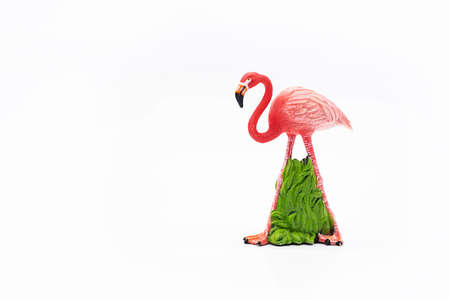 Toy animal figure pink flamingo on white.