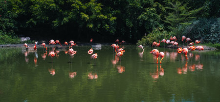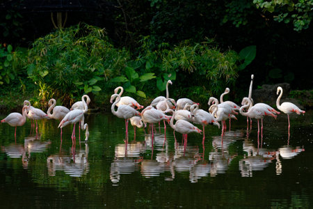 A large flock of Greater Flamingos (Phoenicopterus roseus) in Negara Zoo, Malaysia. Enjoying summer in pond and eating food from the mud.