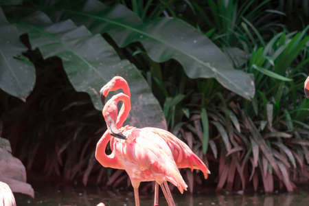Natural background. Pink flamingos nest among green leaves. Dreamy mood, soft look.