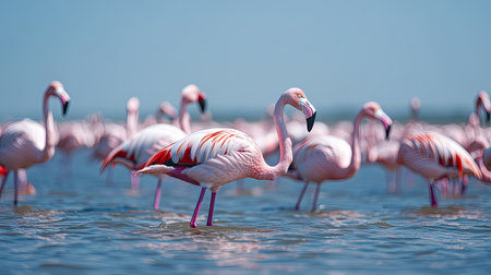 A captivating scene featuring elegant flamingos wading gracefully in calm water beneath a bright blue sky, showcasing nature's beauty and tranquility.