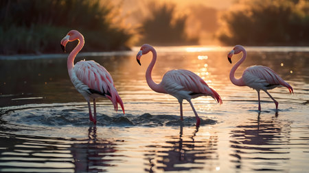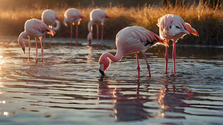 Flamingos feeding in sunset marsh