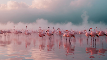 Flamingos wading in a tranquil lagoon at sunrise amid serene pastel colors