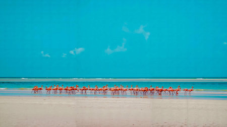 A flock of flamingos walking on a beach