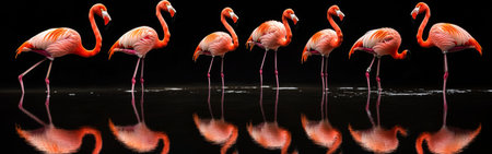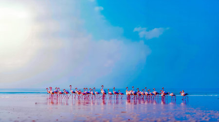 A serene scene featuring a flock of flamingos gracefully standing in calm waters, reflecting their vibrant pink hues against a bright sky. Ideal for nature lovers.