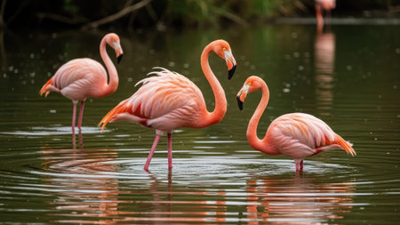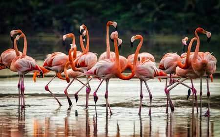 A captivating scene of flamingos interacting in a tranquil wetland highlighting their beauty and social behavior.
