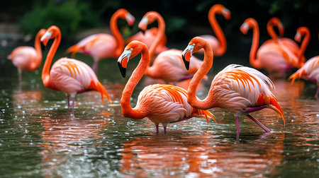A stunning scene featuring a group of flamingos standing by tranquil water, reflecting their vibrant colors in a lush tropical environment rich with greenery.