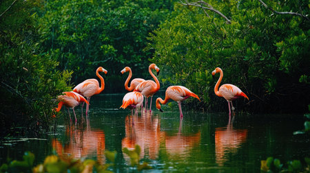 Group of vibrant flamingos gathered in a lush tropical habitat with greenery and water. the striking colors and serene setting make it ideal for nature-themed prints, poster designs, and educational uses in wildlife studies. Generative AI