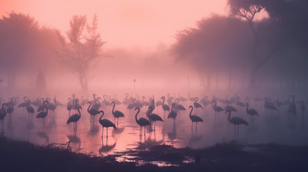 Foggy morning in the swamp with pink flamingos and trees