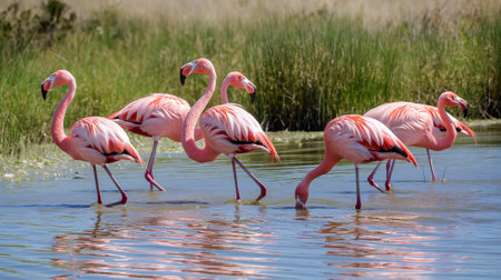 Vivid photograph capturing a beautiful group of flamingos gracefully wading in a shallow lake with natural surroundings