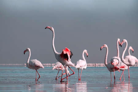 Group of pink flamingos on the sea at Walvis Bay, the atlantic coast of Namibia, Africa.
