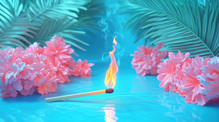 A matchstick ignites with vibrant flames above shimmering blue water, framed by lush green palm leaves and clusters of vivid pink flowers, creating a captivating tropical ambiance.