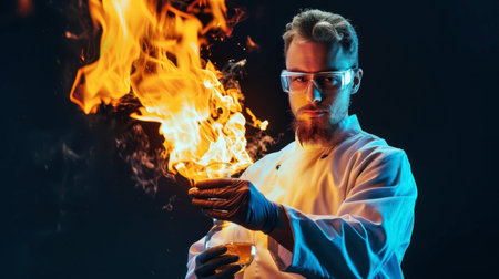 A male scientist wearing a white lab coat and safety goggles holds a beaker filled with liquid that is emitting flames. He is standing in a dark studio with colorful lighting.