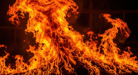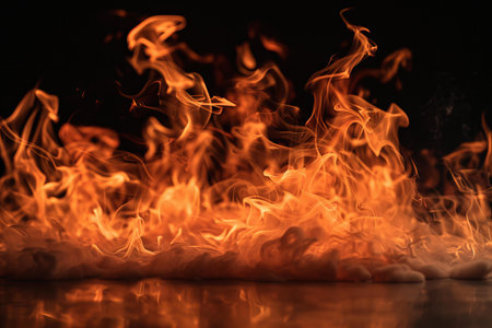 Roaring flames illuminating a black background, creating a bold and intense visual of fire's natural energy