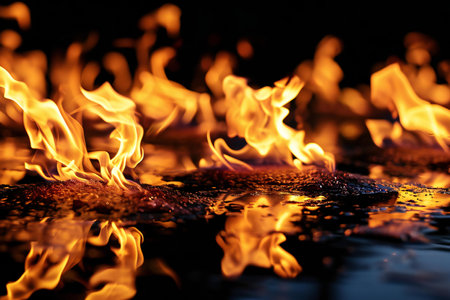 Dynamic flames rising against a dark black background, creating a dramatic contrast between the glowing fire and shadow