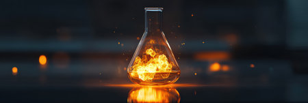 Flames erupting from inside a glass beaker, illuminating a dark science laboratory