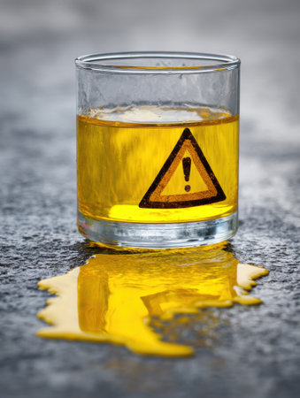 A tipped glass containing bright yellow chemical cleaner spills onto the surface, displaying a warning triangle symbol, emphasizing safety hazards.