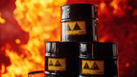 Three black oil drums with caution signs are stacked against a vibrant fire backdrop, highlighting safety concerns in industrial environments.