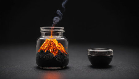 A miniature volcano erupts inside a glass jar, emitting smoke and a bright orange glow