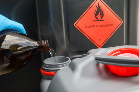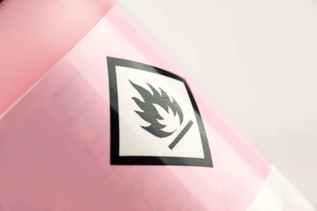 Chemical hazard sign pictogram, Globally Harmonized System of Classification and Labelling of Chemicals (GHS). Flammable liquid danger warning caution sticker with container bottle in storage cabinet.
