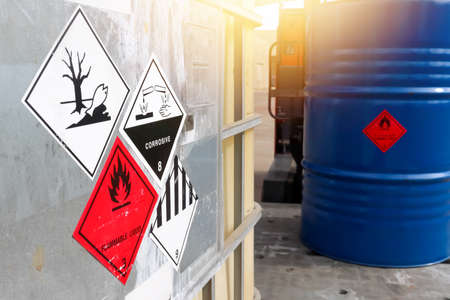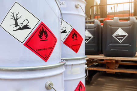 Hazardous chemicals and symbols on containers in factory or laboratory