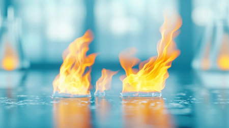 Bright flames erupt in a laboratory as a combustion reaction takes place, showing heat waves and gaseous emissions.