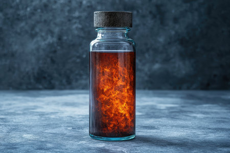 A captivating glass jar filled with amber liquid emits mystical vapor, creating an enchanting atmosphere. Ideal for fantasy, magic, and artistic themes.