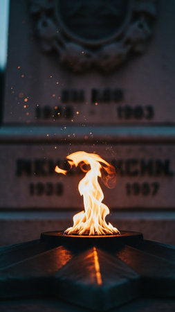 A vibrant orange flame rises against a blurred, dark backdrop with wisps of smoke. The image showcases dynamic movement and contrasts warm colors with cool tones. Suitable for conceptual illustrations, the composition suggests energy, heat, and potential uses in visual media.