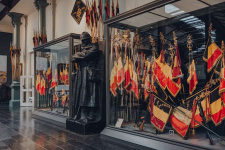 Brussels, Belgium - August 17, 2019: Belgian military exhibits in The Royal Museum of the Armed Forces and Military History, a famous museum in Brussels.