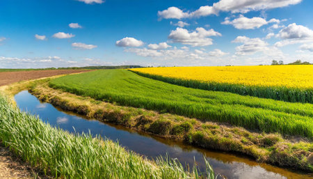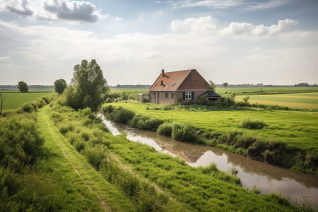 farmhouse surrounded by fields of crops, with waterway in the distance, created with generative ai