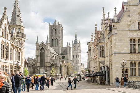 Beautiful medieval city of Ghent with Gothic cathedral in the background