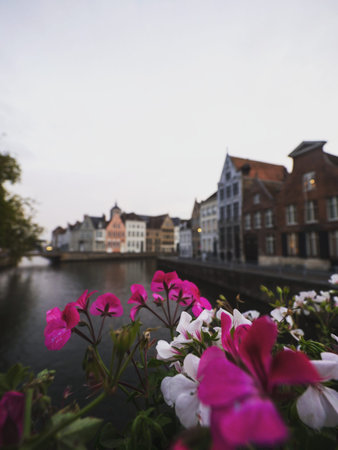 Panoramic view of flowers at river canal channel historic city center Bruges West Flanders Flemish Region Belgium Europe