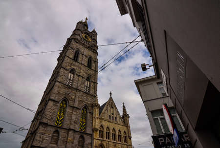 Ghent, Belgium, August 2019. View from the base of the imposing bell tower called Beffroi.