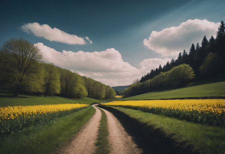 A Quiet and beautiful countryside roads with bright skies and diverse roadside plants generative ai