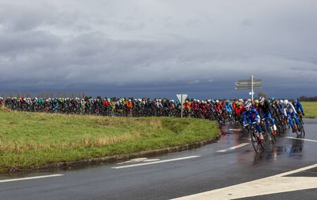 Cernay-la-Ville, France - March 5, 2017: The peloton taking a curve on a wet road during the first stage of Paris-Nice on 5 March, 2017.