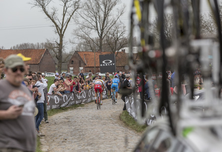 Templeuve, France - April 08, 2018: Rear view of a group of cyclists riding on the cobblestone road in Templeuve during Paris-Roubaix 2018.