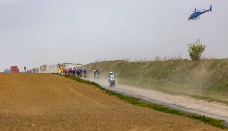 Viesly, France - April 14, 2019: The peloton riding on the dusty cobblestone road from Briastre to Viesly during Paris Roubaix 2019.
