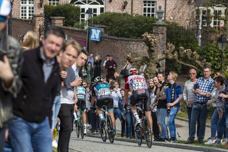 Muur van Geraardsbergen, Belgium - April 7, 2019 : The Belgian cyclist Frederik Frison of Team Lotto-Soudal and the French cyclist Jeremy Lecroq of Team B&B Hotels-Vital Concept, are passing through a crowd of excited spectators on the top of the famous M