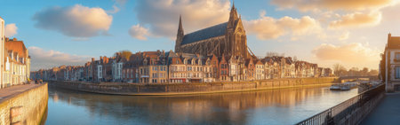 The medieval city of Amiens showcases the grand Notre-Dame Cathedral and historic buildings, with the River Somme reflecting warm late afternoon light.