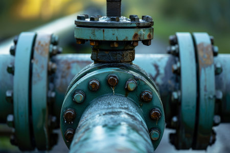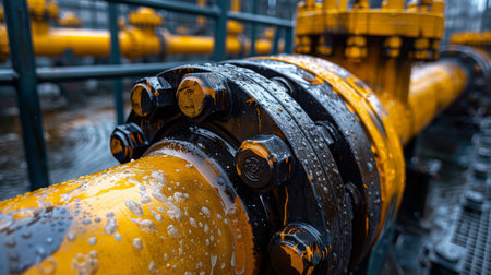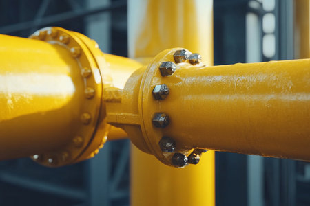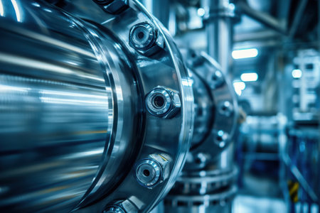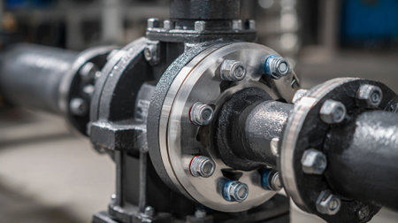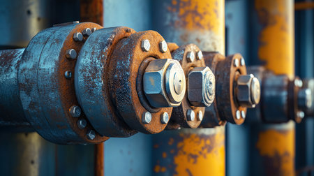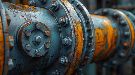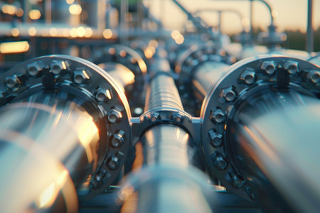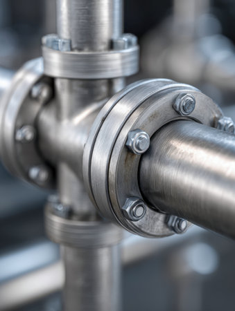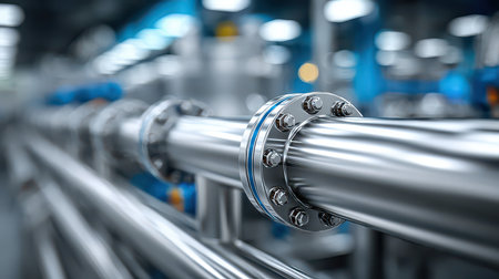 Shiny industrial pipeline system with large bolts connecting pipes in a factory