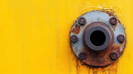 Close-up image of a rusted pipe flange set against a vibrant yellow surface. The flange features visible corrosion, bolts, and intricate textures, showcasing industrial elements.