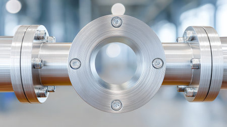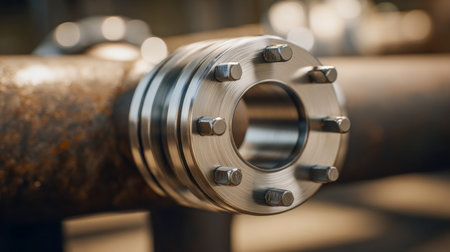 A close-up view of a sleek metallic pipe fitting with bolts, emphasizing modern engineering and quality craftsmanship in an industrial space.