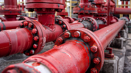 Industrial red pipeline system with valves and flanges. ai generated