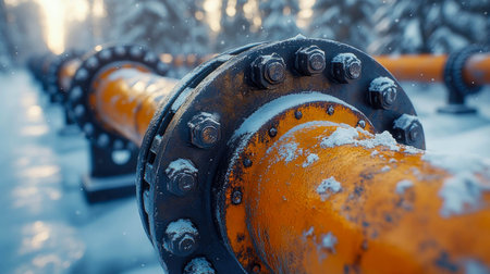 A close-up of an industrial pipeline in winter, covered in snow, showing its bolts and rugged metal texture in cold, frosty surroundings.