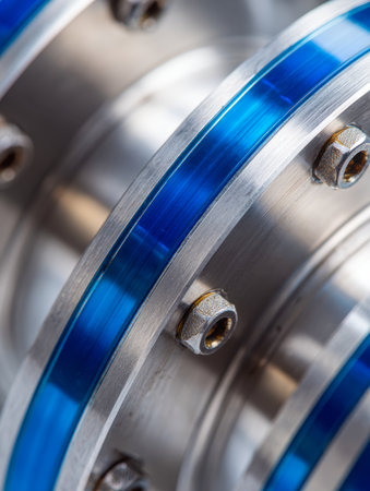 A close-up of a machined metal flange secured with precise bolts, featuring a vibrant blue translucent gasket that highlights advanced sealing technology in industry