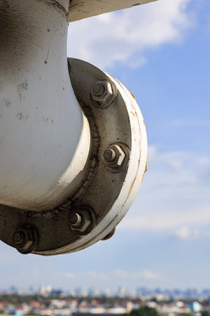 Part of the gas pipeline close-up. High pressure pipe flange connection. Industrial background for the supplier of equipment for gasification.