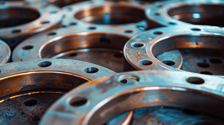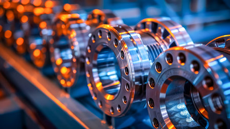 High Precision Metal Industrial Machinery Parts with Flange Patterns on a Blue Tinted Factory Background AI Generative