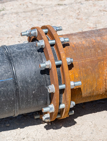 close-up view of the flange with bolts of a heavy metal joint on a pipe that transports liquid to an industrial plant.