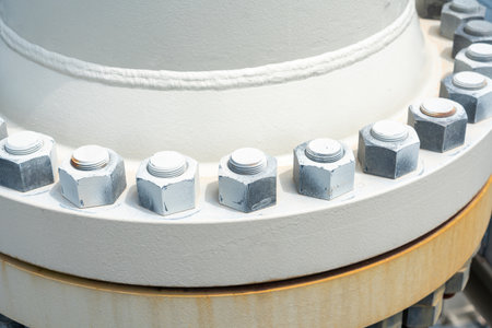 Close-up of an industrial bolted flange showcasing engineering precision and structural reliability