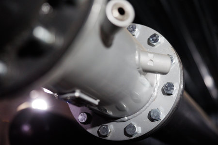 A close-up of a metal pipe fitting, highlighting strong bolts and a smooth surface in a well-lit workshop environment.