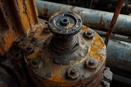 Close-up view of a weathered and rusty pipe fitting, revealing the intricate textures and colors formed over time in a derelict industrial setting, whispering stories of past operations.
